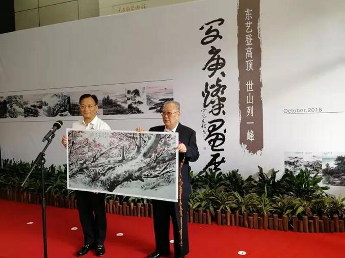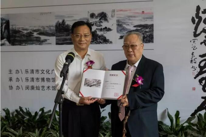 闵庚灿先生还向周昌谷艺术馆捐赠了他的八尺巨幅画作《漫山雪压铁杉枝》和一幅竖轴小品。乐清市委常委、统战部长赵明皓给闵庚灿颁发了收藏证书。乐清市副市长陈微燕主持闵庚灿画展开幕式。