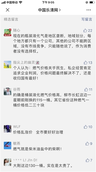 “柴米油盐酱醋茶,瓶装燃气就是这个‘柴’,企业自主定价并不代表政府职能部门放任不监督,事关民生,希望能加强有效监管,民生无小事。”网友“Daliang”说。