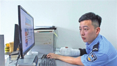 9月8日10时许,杨先生来到北白象派出所报警,称停在自家院子里的一辆电瓶车不见了。民警施亨浩随即给杨先生做了报案笔录。看着眼前一只手打着石膏,只留另外一只手敲击键盘打字的施亨浩,杨先生有些困惑。施亨浩解释这是前段时间不小心摔伤造成的。