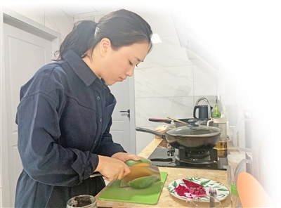 在现场,赵赛娇向记者展示了她的拿手好菜:“爱心”鸡蛋饼和“兔子”吐司。她将事先准备好的食材一一拿出,麻利地将4个鸡蛋进行蛋黄蛋清的分离,在蛋清中放入胡萝卜碎,蛋黄中放入西蓝花碎。“黄配绿,白配橙,这样的蛋煎出来会很好看。”赵赛娇一边说着,一边打开煤气灶,在锅里倒入少许色拉油,右手拿着锅把手,靠着手腕的力量转动,让油均匀地遍布锅里。随即,她拿出厨房纸巾,将多余的油吸走,待油升温到七成热时,快速将一半的蛋白倒入锅中,成形后推到一边,继续倒蛋黄。
