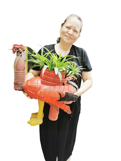 神气十足的大公鸡、憨态可掬的大水牛、栩栩如生的小天鹅、异域风情的土著人……在徐阿姨的巧手下,一个个用塑料桶、塑料瓶等做出来的花盆着实讨人喜欢。她从前年开始痴迷手工制作,至今已做了上百个创意十足的花盆。