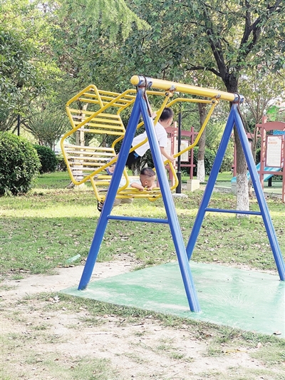 零部件松动、使用灵敏度不足,这些看起来问题不大的“小病症”,却暗藏安全隐患。记者注意到跷跷板似乎并未做好“预埋”工作,缓冲件磨损严重,底部用来加固的水泥出现晃动情况,使用时跷跷板仿佛要“拔地而起”;有一台三人引体架更是“缺胳膊少腿”,其中一侧的配件已“不见踪影”。