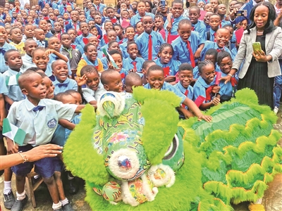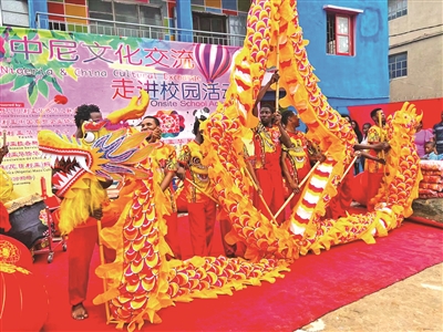 尼日利亚华星艺术团不仅为学生们带来了精彩绝伦的舞龙表演,还邀请学生们参与表演彩带龙。“彩带龙吸取中国传统舞龙、武术、舞蹈和体操等精华,简单易学,不仅能让非洲学生体验中国文化的魅力,还能感受舞彩带龙带来的吉祥和喜庆。”倪孟晓说。
