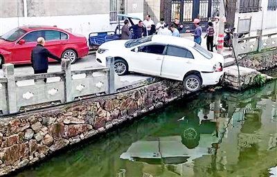就在踩油门时,杨某用力过猛,车辆突然快速往后倒车,一时慌神的他忘记了松油门,结果车辆撞上路边停放的红色轿车,随后失控撞穿河边护栏,车辆一半冲出护栏,犹如跷跷板一样,险些掉入河中。所幸事故并未造成人员受伤。