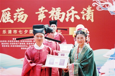 在爱情名山——雁荡山夫妻峰的见证下,新人们许下了誓言。此次“七夕”国潮集体婚礼,让市民在传统文化中感受到了“中国式浪漫”。