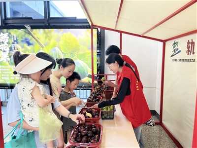 在盐盆站出站口的熙熙攘攘中,有一抹独特的风景线悄然展开。共富驿站里,大幅电子广告牌上展示着清新诱人的无花果广告。驿站柜台上,一篮篮软糯香甜的无花果一字排开,吸引着过往旅客的目光。