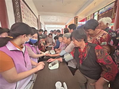 9月29日上午,在秦垟北文化礼堂,呼吸科、心血管、骨科、眼科、妇科、内科等常见的“临时科室”一应俱全,连移动的“心电图室”都临时搭建了起来。乐清市女知识分子联合会的义工们穿着粉色马甲,服务在量血压、测血糖等多个岗位,乐清市人民医院十余名“专家号”正细致地为前来问诊的群众答疑解惑、提供健康指导。秦垟北、秦垟南等村300多名老年人有序在各个“诊室”排队就诊。“按照路线,我量了血压测了血糖,也看了骨科和心血管科。服务很周到,让我们在家门口就能享受到大医院的治疗。”62岁的黄大妈听闻今天有义诊,早早地过来,享受到了“流水线式”的公益服务。