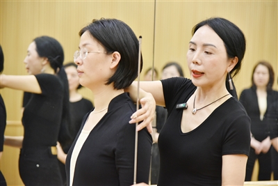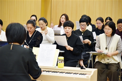 “手可以插腰,把牙关打开,吸气时,要把气吸到腹腔……”11月7日14时,声乐课准时开课。黄雪芬老师带领学员做了放松操后,开始带领大家练声、学习歌曲《画月亮》的曲调。黄老师边弹钢琴边示范,学员们跟着一起唱,教室里回荡着动听的歌声。