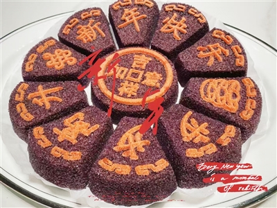 传统松糕选用优质的糯米、梗米以及红糖,配以红枣、花生、葡萄干等干果,蒸出的松糕香气扑鼻。“一般市面上的松糕用的糯米比较多,但是现在一部分人觉得糯米不好消化、升糖快,追求更健康的饮食,我们就对传统松糕做了改良。”孙蕊说,在常见松糕的基础上,她将主材料改为紫米,通过比例的调和做出紫米松糕,枸杞、蔓越莓、核桃点缀在紫米松糕上面,别有一番风味。为了营造过年氛围,孙蕊在紫米松糕上又加了点创意,在她的巧手下,印有红色“新年快乐”“步步高升”等吉祥寓意字样的紫米松糕沿盘沿摆放,像极了一朵正在盛开的紫花。