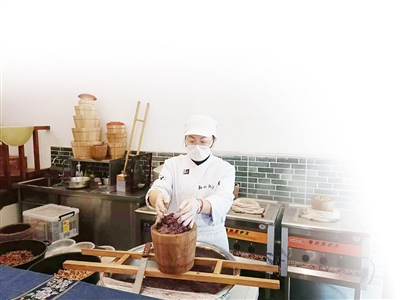孙蕊在蒸松糕。
