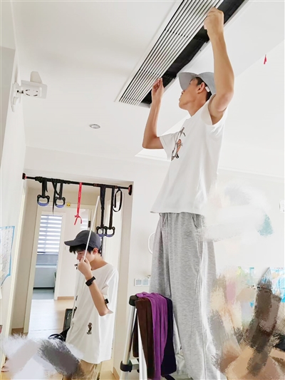 小张是乐清市职业中等专业学校的一名高二学生,这个暑假他和同学小叶一起,跟着专业做居家清洁的亲戚张师傅当了回空调清洗工。