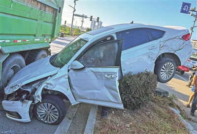 乐清日报讯(乐清市融媒体中心记者 杨海虹 通讯员 余甘棠 徐建奔)日前,在北白象镇电器城大道蒋家桥村附近路段一辆白色轿车横在道路中央的绿化带上,车身被下方的大石块顶起,呈悬空状态;车体四周布满刮擦痕迹与凹陷,驾驶室车窗碎裂,车门、保险杠等部件受损脱落,右前轮胎更是扭曲变形。而在轿车前方,与之相撞的重型货车停在路边,车头左前侧同样有明显撞击痕迹,地面上则散落着大量轿车零部件及泥土,整个现场狼藉不堪。