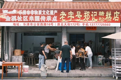 郑记糖松糕店原址在市区北大街172号,在那条承载了无数乐清人记忆的老街上,一开就是一百多年。直到去年,因北大街历史文化街区改造,店铺才迁至如今的公安西路,位置变了,但那股熟悉的味道被郑乐剑保留了下来。
