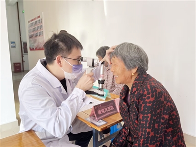 在眼视光医院服务点前,五位医生分工协作,为村民提供视力检测、眼部裂隙灯检查、泪道冲洗等服务。“我们今年已经开展了80多场下乡义诊,为患有白内障的老人提供申请补助咨询服务。”眼视光医院公益医疗部工作人员表示。