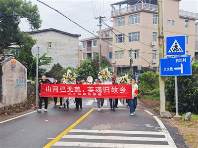 “山河已无恙,英魂归故乡!”胡齐文和家族百余名成员齐聚于此,举行一场迟到了86年的安葬仪式。那块从江苏邳州带回的青石墓碑,被郑重地安放在祖坟前。一同安置的,还有从邳州带回来的那把黄土,与胡定元的妻子合葬一处。