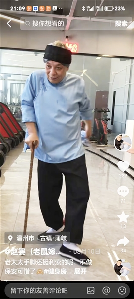 盛夏时节,他裹着长袖长裤、戴着假发套,汗流浃背时便掏出手绢擦一擦,依旧乐在其中:菜市场里,他弯腰与摊主讨价还价;寺庙中,他慢悠悠“找人”,跨过高门槛时故意装作被绊,引得旁人下意识伸手搀扶;就连健身房,都留下过“赵婆”的趣事,见教练用跑步机,他一时好奇扔了拐杖也跑上去尝试,结果不慎摔了个连滚带爬,事后却笑着调侃:“早知道把速度调快点,演得更真些!”而这些画面,全是一镜到底的真实记录,没有剪辑与特效,拍摄者也是他随手喊来的路人。