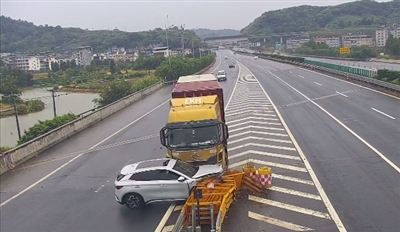 随后,交警调取了事发时的公共视频。画面显示:事发时,白色小车从高速主线驶入南塘出口后,在右侧车道行驶;此时,一辆大货车在左侧车道后方正常行驶。突然,小车毫无征兆地减速并向左变道,试图重新返回主线。后方货车司机发现险情后,立即紧急制动,但因两车距离过近,且小车变道动作缓慢,货车避让不及径直撞上小车左侧车身,随后将其“平推”至分流岛,最终两车停在左右车道之间。