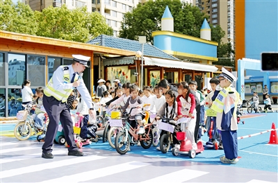 活动中,最让孩子们兴奋的是情景模拟体验环节。交警和幼儿园老师们用道具在操场上布置出人行道、机动车道和红绿灯,准备了小自行车、平衡车、小三轮车等道具。孩子们分成小组,分别扮演“小交警”“行人”“骑行者”等角色。