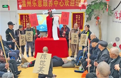 音乐一响,“黑脸包公”猛地掀起“官袍”,踩着木凳一脚踏上桌子,“唰”地甩出写满“罪状”的白纸……满室银发老人们的笑声差点掀翻屋顶。近日,位于城东街道后所社区的温州乐意养老服务有限公司里,一场诙谐有趣的《铡美案》情景剧正在上演。“80后”养老院院长陈金凤带着20多名高龄老人自编自演,在忘我的角色沉浸式体验里抛开岁月痕迹,这个满是烟火气的欢乐小剧场,不仅装着老人们纯粹的欢喜,更藏着养老服务中“让时光变慢,让快乐变浓”的暖心巧思。
