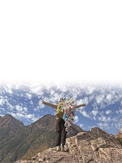 为此,每在户外登山过程中,她一边用言语提醒驴友:“把垃圾带走,别弄脏了美景。”一边用行动去感染更多人,将废弃的塑料瓶串成披风,负重奔跑下山。这“言传”与“身教”,简直是一堂生动的环保课。