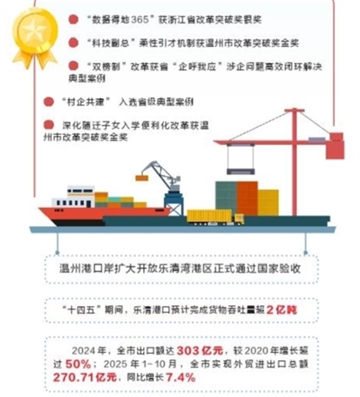 推进高水平对外开放,乐清在“十四五”期间成绩斐然——2024年,全市出口额达303亿元,较2020年增长超过50%;2025年1-10月,全市实现外贸进出口总额270.71亿元,同比增长7.4%。