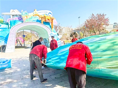 现场一个高约3米的鲤鱼造型灯组内部框架已基本完成,一名电工正在灯组旁调试安装在鱼嘴部位的泡泡机。“这个泡泡机将在亮灯后配合运行,营造出鲤鱼吐泡泡的效果,想表达‘年年有余’的寓意。”新春灯展项目经理谭俊辉介绍道。