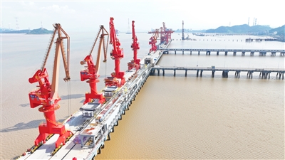 冬日暖阳下,乐清湾海面大型轮船穿梭,乐清湾港区A区码头卸船机高耸而立,装满义乌、永康等地货物的集装箱经乐清湾铁路从这里出海。