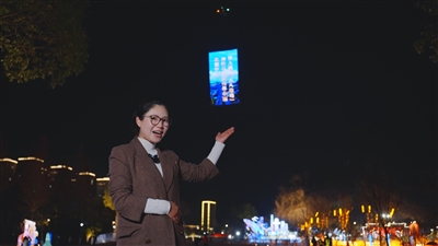 1月9日18时许,在乐清城市文化CBD(乐清大剧院边上)的草坪上,一面面积达50平方米的屏幕,平稳攀升至40米的夜空,化作一幅悬浮的“空中画卷”。地面上,前来观赏新春灯展的市民们举起手机,记录下这绚烂的一刻。