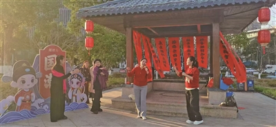 原来,这是本次新春灯展特意为戏曲爱好者开设的一处排练、交流场地——梨园角戏曲汇。这方小小的舞台位于靠近市图书馆方向的一个小亭子内,亭子四周挂着红色的灯笼和对联,洋溢着浓浓的节日氛围。旁边还立着一个精美的立牌,展示着国潮戏曲人物,古风古韵扑面而来,欢迎戏曲爱好者前来互动。