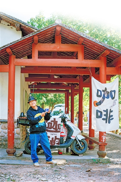 位于雁荡山灵峰景区附近,一辆改装自复古摩托车的移动咖啡车散发着诱人的香气,时不时有路人光顾,点上一杯现煮咖啡。
