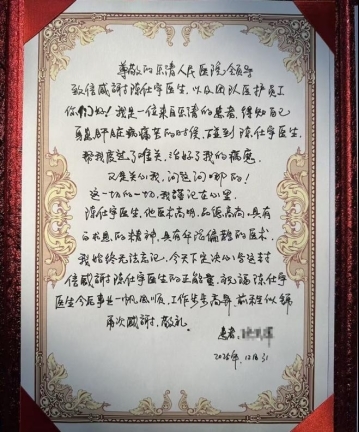 这封感谢信,如同一束温暖的光,照亮医患之间纯粹、动人的情感。陈仕宇医生用他的精湛医术和高尚医德,为患者驱散了病魔的阴霾,带来了生的希望;而患者用一封饱含深情的信,传递着对医生的感恩与敬意。