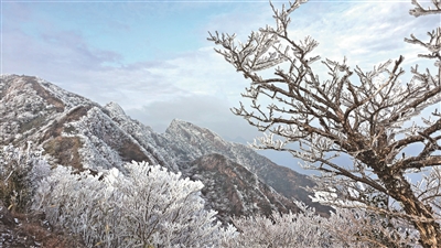 受冷空气影响,近日,雁荡四尖出现雾凇奇景。记者登上百岗尖,只见草木裹银、雪树漫山,雁荡四尖被冰雪覆盖,呈现峭壁凝霜的苍劲与冰清玉洁的浪漫。极目远眺,晨阳洒落乐清湾,海面泛起金色涟漪,冰峰映金海,令人陶醉。