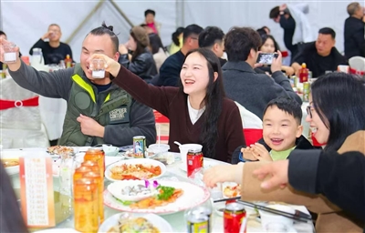 2月1日晚,市区绿城·琨玉园小区1号楼附近的空地上灯火通明,人声鼎沸。15张大圆桌在暖帐里依次排开,236名业主及家人欢聚一堂,在欢声笑语中辞旧迎新,用一场温馨喜庆的“邻里分岁酒”,为新春增添了浓浓烟火气。