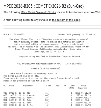 公告中,一颗新发现的彗星被正式命名为C/2026 B2(Sun-Gao)——孙-高彗星。其中的“孙”,指的就是孙国佑。这颗彗星不仅是中国人发现的第23颗彗星,也是第四颗以中国天文爱好者个人姓氏命名的彗星。对他来说,这标志着20年“追星”之路的最后一块拼图,已集齐。