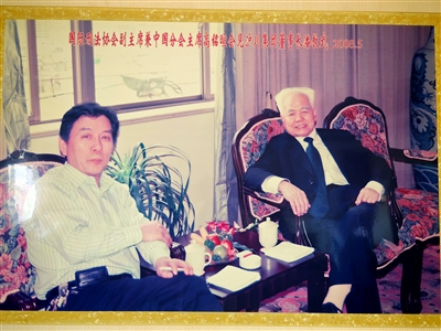 “刑法学泰斗”高铭暄(右)与潘教武亲切会谈。资料图