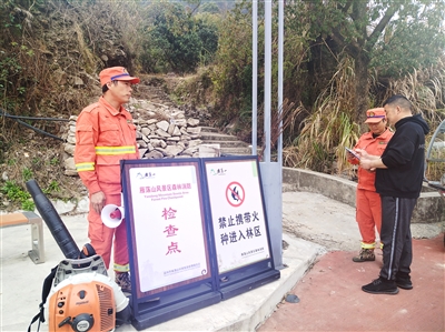图为雁荡山景区一进山入口,值守人员严格执行防火检查,耐心向群众讲解防火规定,“禁止携带火种进入林区”的标识牌清晰醒目。