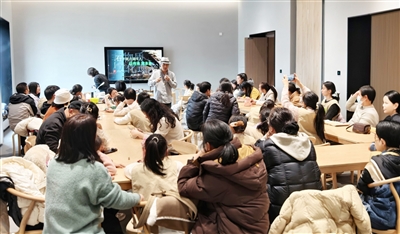 她介绍了米塑和北方面塑的区别,欣赏了她的《年夜饭》、生肖米塑等作品后,进入体验创作环节,她指导大家用软糯年糕创作一盆小巧玲珑、无需浇水养护的“多肉”,为家居生活增添一抹清新绿意。用年糕做成18片小“多肉”,叶片有水滴状、花瓣状,大的贴外面一层,最小的放中间,共三层,层次分明。最后上色,底色是淡绿色,郑小红指导大家在手掌心用水和着红色颜料,将年糕揉搓出红色浆汁,再轻点在“多肉”的尖顶上,一盆栩栩如生的“多肉”就做好了。
