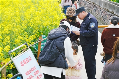 在执勤过程中,乐清站派出所的民辅警们还坚持“执勤+宣传”双管齐下。他们敏锐地抓住游客赏花兴致正浓的时机,积极开展铁路安全知识宣讲活动,运用通俗易懂的语言,将铁路安全知识、反诈知识以及防火灾知识等内容巧妙融合,以接地气的方式向游客传递安全理念。在轻松愉快的氛围中,法治宣传深入人心,游客们在欣赏美景的同时,也增强了自身的安全意识和法治观念。
