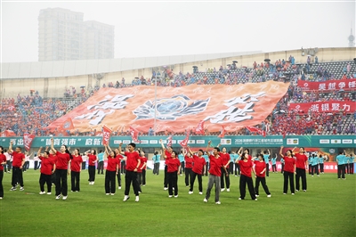 赛前,全场大合唱《歌唱祖国》,歌声穿透雨幕。巨幅“温州必胜”TIFO在主看台升起,乐清、龙湾、龙港、鹿城等温州县市区的旗帜围绕“温州必胜”四个字,显示温州一家人的气势。两位乐清“雁荡山”形象的“小龙人”也来到现场,和其他县市区的吉祥物一起为温州队开场加油。温州游泳运动员徐嘉余和温州园博会吉祥物共同为比赛开球。